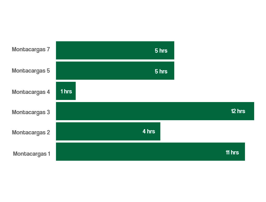 Este reporte permite consultar el tiempo de encendido de cada montacargas para analizarlo en cada hora del día, esto nos permite poder examinar los tiempos muertos de cada turno, y con ello realizar cambios en logística para poder obtener un máximo beneficio de los equipos y personal.